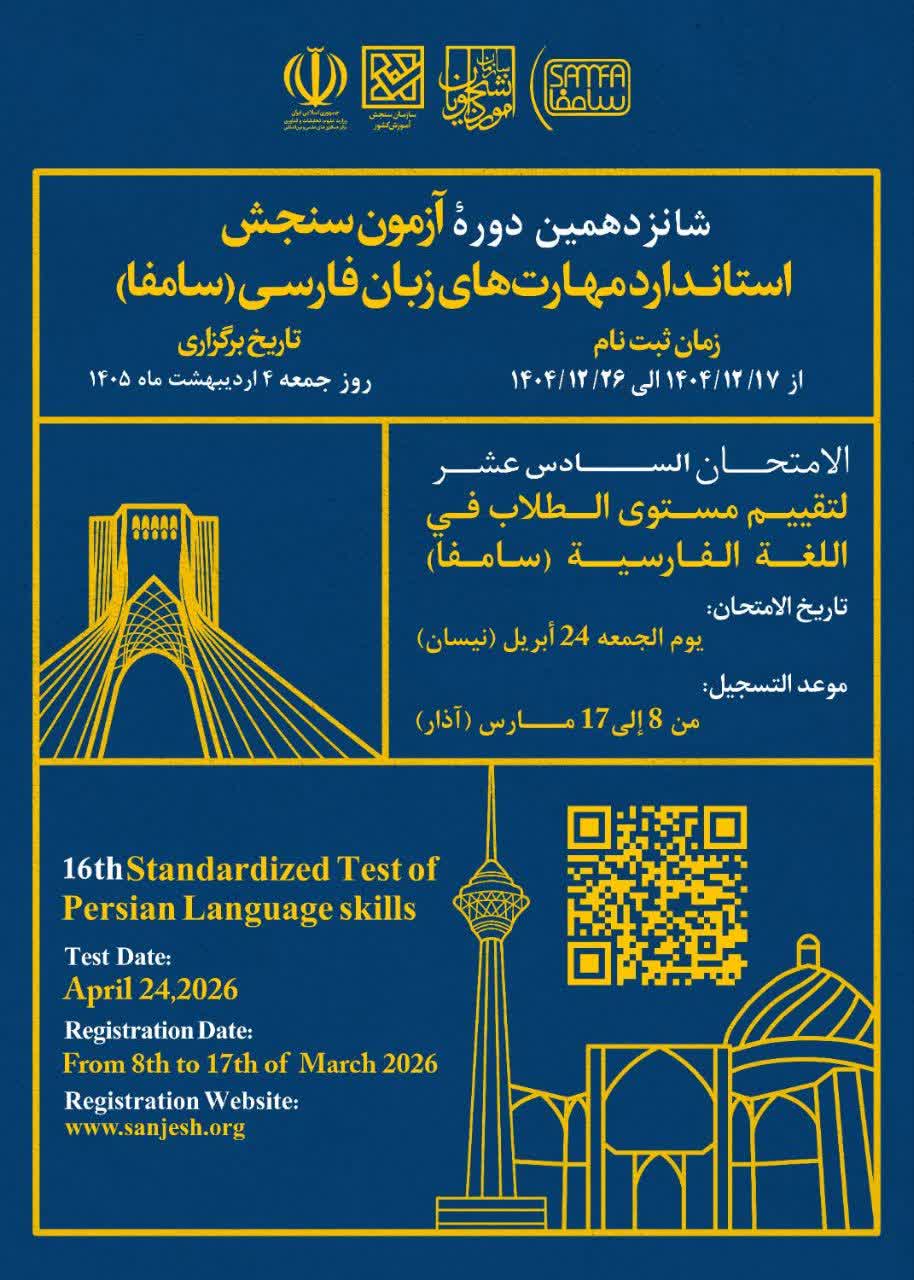 شانزدهمین دوره آزمون سنجش استاندارد مهارت‌های زبان فارسی(سامفا )در روز جمعه 4 اردیبهشت 1405 برابر با 24 آوریل2026 برگزار خواهد شد.